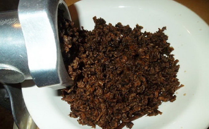 Épluchez et faites bouillir les champignons pendant 25 minutes, laissez-les refroidir et passez dans un hachoir à viande.