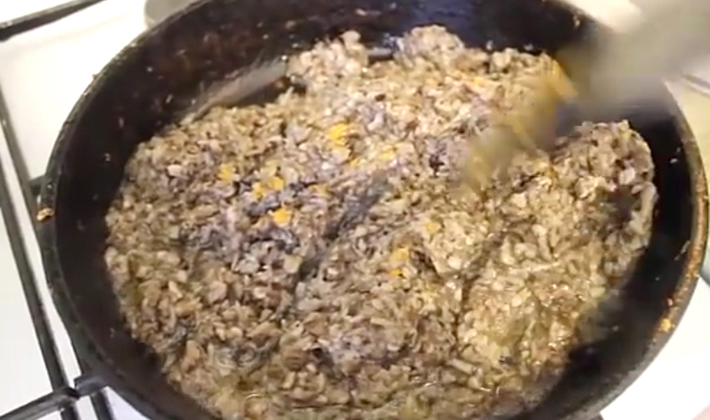 - Les oignons sont concassés en demi-anneaux et frits séparément dans l'huile jusqu'à coloration dorée.