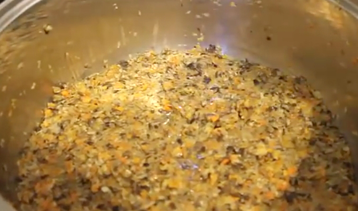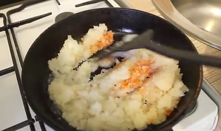 Les oignons et les carottes sont pelés, coupés en dés et frits jusqu'à tendreté dans une poêle à frire séparée. Les légumes ne doivent être disposés que dans une poêle chaude avec de l'huile chaude.