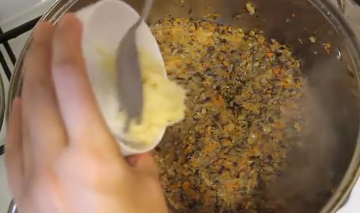 - Ajouter l'ail écrasé et le sel au goût, mélanger la masse entière et faire frire pendant 5 minutes.