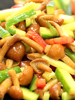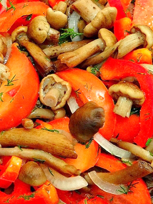Combinez avec les champignons, salez au goût, ajoutez les pois de poivrons et versez le vinaigre, mélangez.