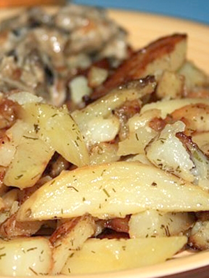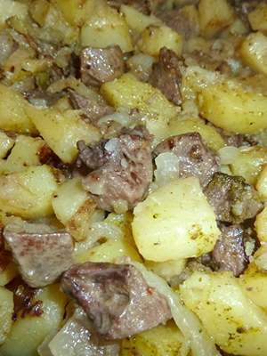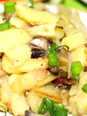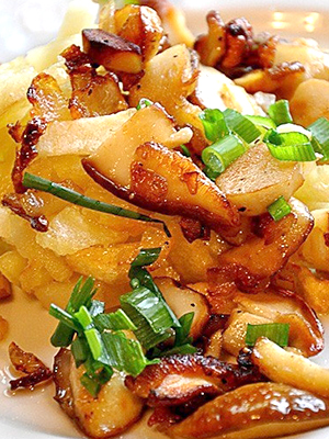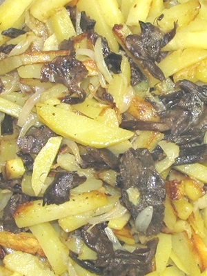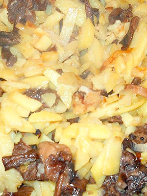 - Pommes de terre frites avec champignons, viande et oignons verts