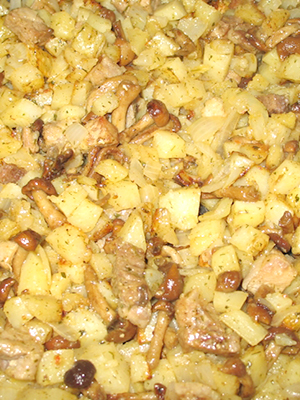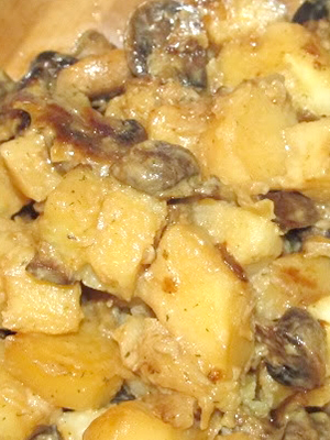 - Champignons forestiers frits avec des pommes de terre et des coeurs de poulet