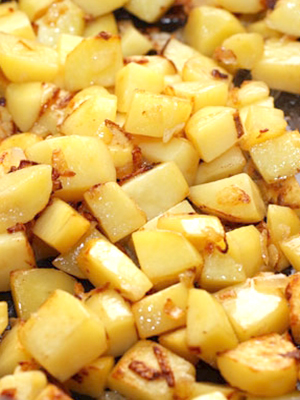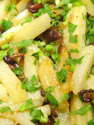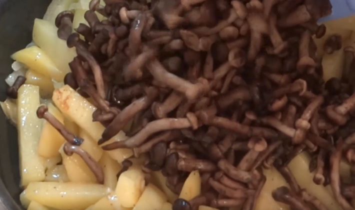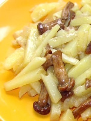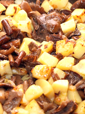- Friture de pommes de terre au miel, aux champignons, au poulet et à l'ail
