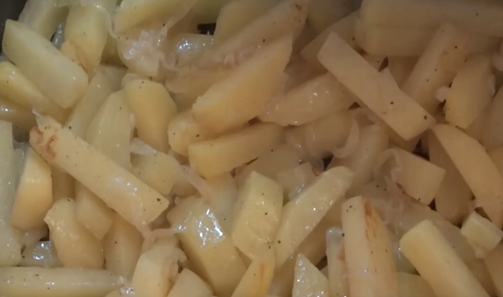 - Nous continuons à faire frire jusqu'à ce que tout soit bien cuit et pendant ce temps, faisons les pommes de terre