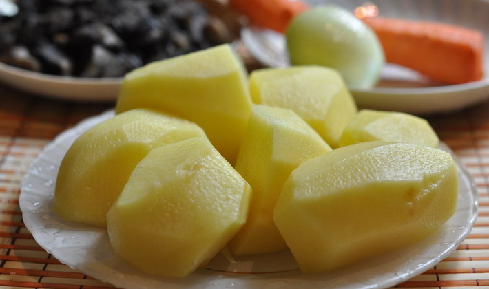 - Vous devez d’abord préparer tous les ingrédients: dans l’eau froide, laver la viande, la peler et la laver avec des pommes de terre et des oignons.