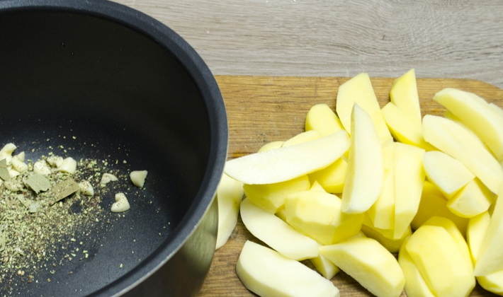 - Nous introduisons des pommes de terre, des oignons, du sel à votre goût, mélangez et versez de l'eau dans 1/3 de la cocotte.