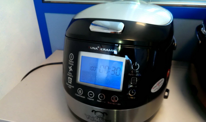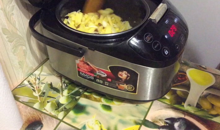 - Réglez le mode “Cuisson” sur 40 minutes, introduisez l'huile restante, fermez le couvercle du multicuiseur et attendez la fin du processus de cuisson. Certaines ménagères recommandent d'ouvrir le couvercle 2 à 3 fois et de mélanger le contenu avec une spatule en bois ou en plastique.