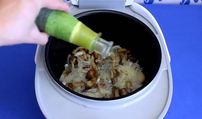 Versez l'huile sur le fond du bol multicuiseur, mettez les champignons et faites frire pendant 10 minutes.