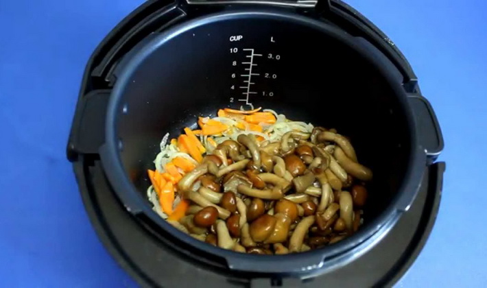 - Envoyez les champignons aux légumes, mélangez et activez le mode «Friture» pendant 10 minutes.
