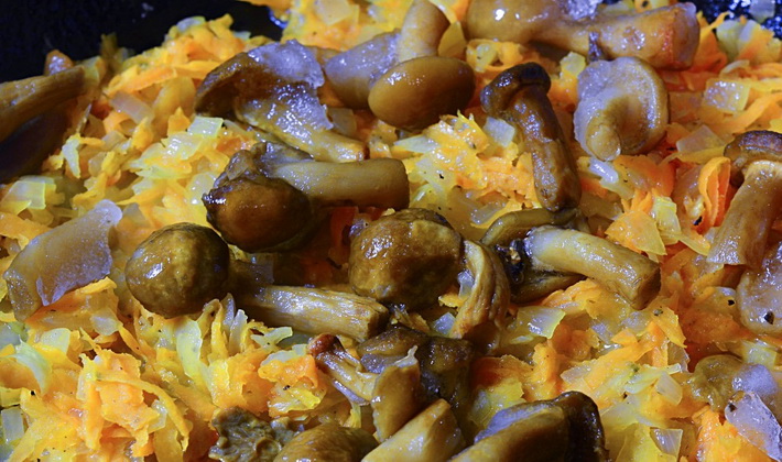- Les champignons pré-décongelés sont lavés et coupés (s'ils sont gros), puis envoyés dans des légumes.