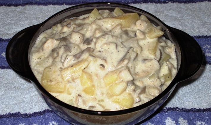 - Pommes de terre cuites au miel, aux champignons, à l'ail et à la crème sure dans une cocotte