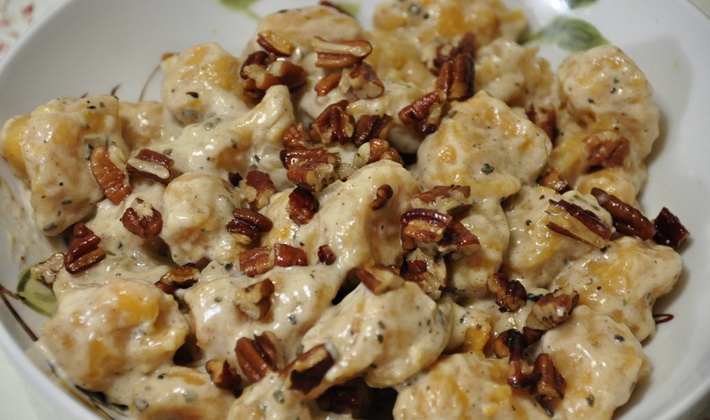 Pommes de terre parfumées aux champignons au miel, servies avec de la choucroute ou des concombres salés.
