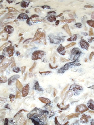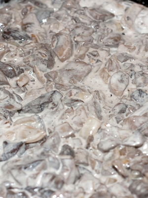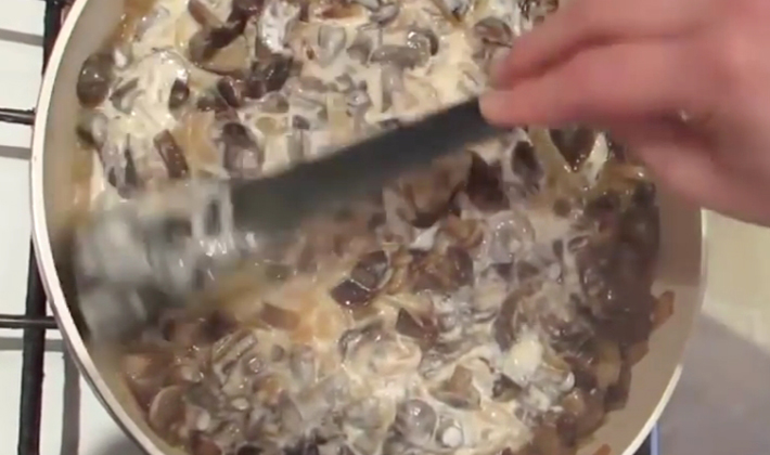 - Mélanger la crème sure avec la farine, battre au fouet, saler et verser dans les champignons avec les oignons.