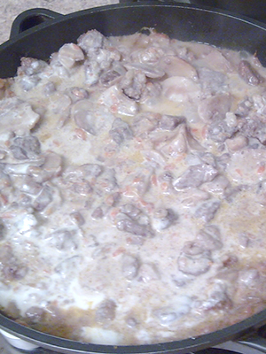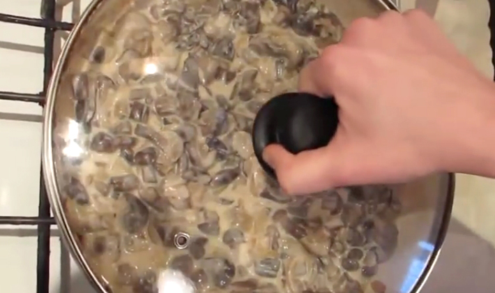 - Ajouter les champignons, verser la crème sure, remuer et laisser mijoter pendant 20 minutes. à feu doux.