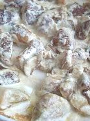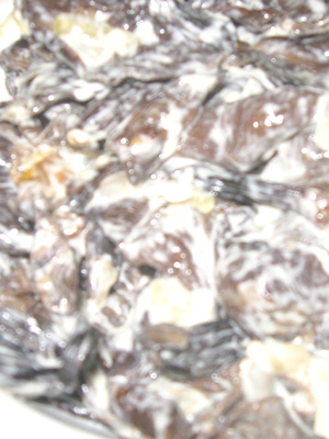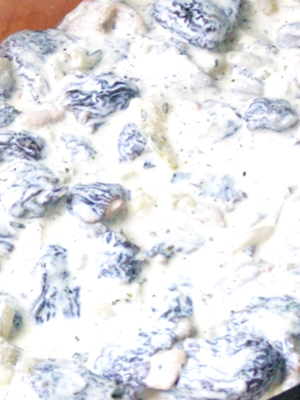 - La crème sure est combinée avec du fromage à la crème râpé, de l'ail pilé, du poivre moulu, des œufs de poule et des assaisonnements.