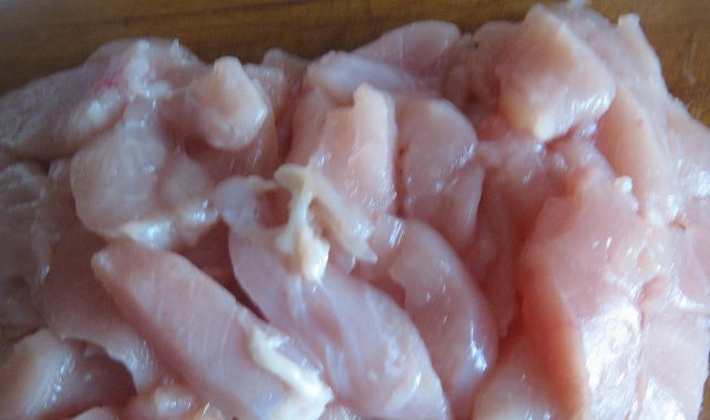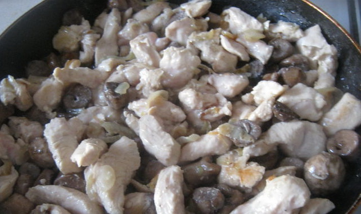 Vous devez d’abord mettre la poitrine de poulet 20 minutes dans de l’eau en ajoutant sel, poivre et feuille de laurier. Puis égouttez le bouillon, laissant 1,5 c. À soupe, et coupez la viande en cubes.