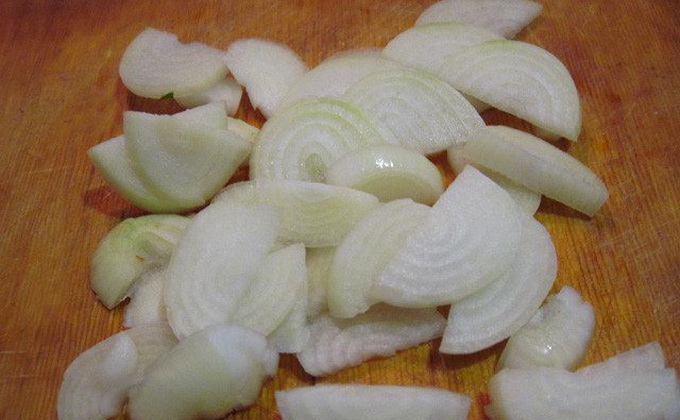 Nous nettoyons les oignons, les lavons et les coupons en demi-anneaux.