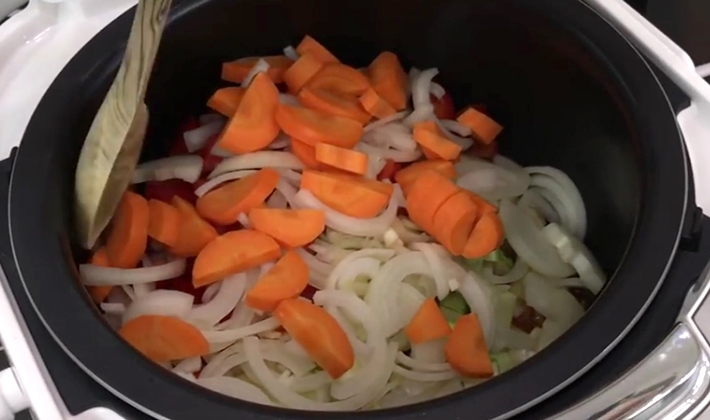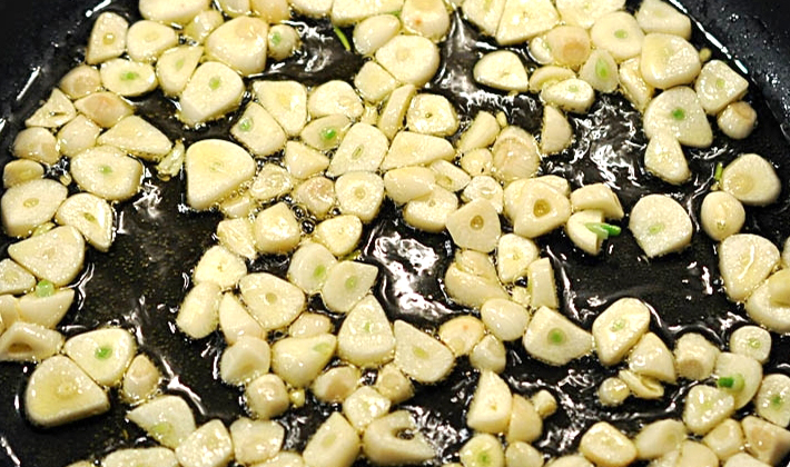 Un peu d'huile végétale est versée dans le bol multicuiseur et de l'ail haché en cubes est ajouté. Allumez le mode «friture» pendant 3 minutes jusqu'à ce qu'une odeur brillante d'ail rôti apparaisse.