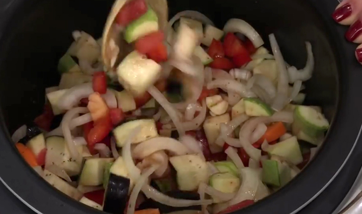 Trempez tous les autres légumes dans le bol multicuiseur, ajoutez du sel au goût, les épices préférées et mélangez bien pour que le sel et les épices soient répartis uniformément dans la masse.