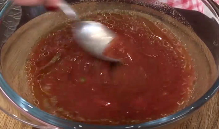 Verser la pâte de tomates diluée dans de l'eau dans le bol de l'appareil de cuisine.