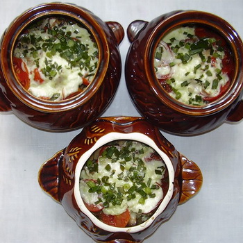 3 cuillères à soupe l diluer la mayonnaise avec 100 ml d'eau, ajouter le fromage râpé, mélanger et verser dans chaque casserole.