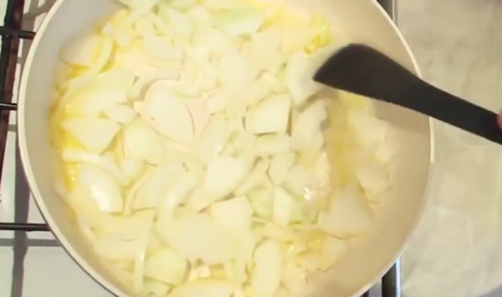 - Ils sont disposés dans une poêle avec des oignons et frits jusqu'à ce qu'ils soient dorés.