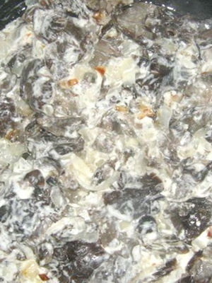- Verser dans la masse de champignons, mélanger et laisser mijoter dans la crème sure à feu doux pendant 10 minutes.