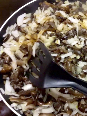 - Dans une poêle à frire séparée dans l'huile, faites revenir les champignons jusqu'à ce qu'ils soient dorés et mettez l'oignon et la saucisse.