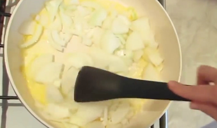 Faire frire à feu moyen jusqu'à ce que les oignons soient dorés (ils ne peuvent pas être dorés, cela gâcherait le goût du plat).