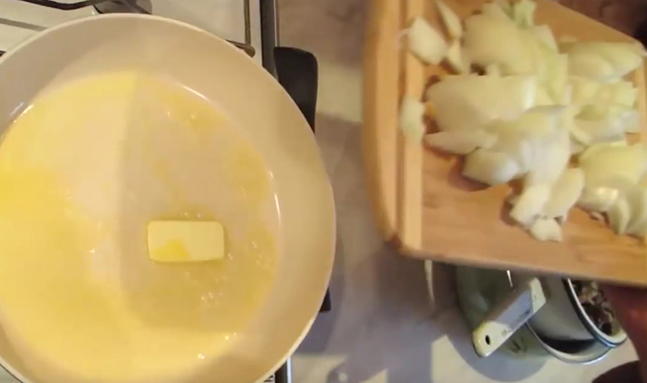 Retirez la couche supérieure de l'oignon, coupez-les en fines rondelles et mettez-les dans du beurre fondu.