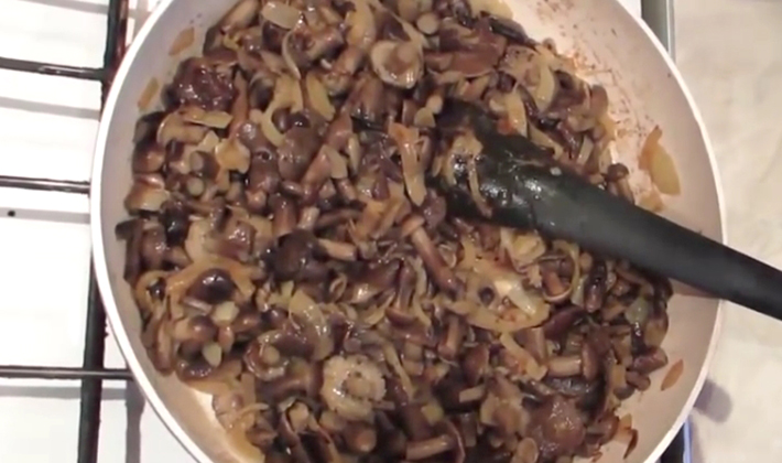 - Faire frire les champignons bouillis dans l'huile jusqu'à ce qu'ils soient dorés, ajouter l'oignon, les couper en dés et les faire frire pendant 10 minutes supplémentaires. à feu moyen.