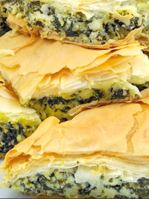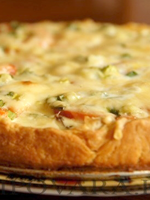 - Mettre la garniture, verser sur le mélange fouetté d'oeufs et de crème sure, verser le fromage râpé et cuire au four à 180 ° 40 min.