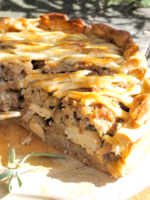 - Décorer les bords de la tarte avec le reste de la pâte et percer le milieu à plusieurs endroits avec un couteau pour que la vapeur chaude sorte.