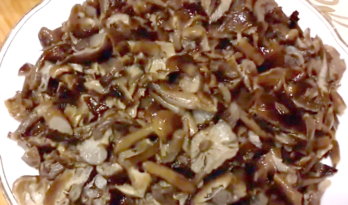 - Hacher les oignons en demi-rondelles, les faire frire et les mélanger avec les champignons, le sel et le poivre.