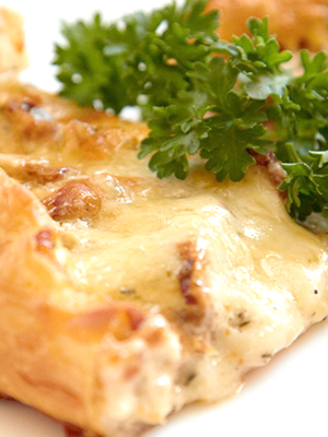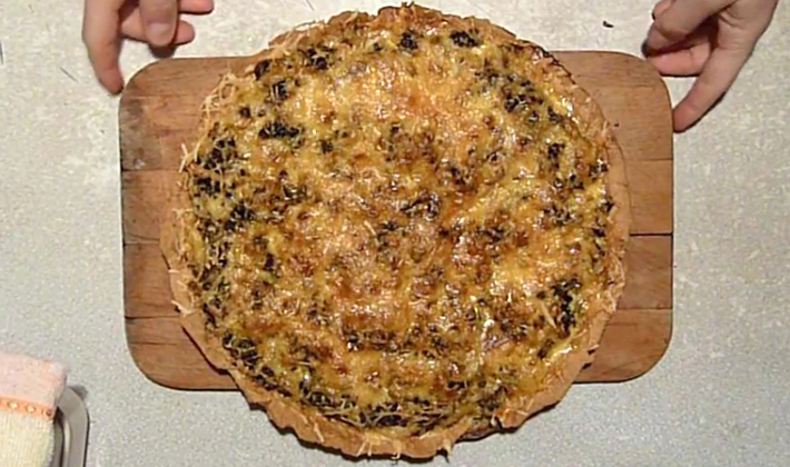 - Répartir la garniture et garnir d'un mélange d'œufs battus, de lait et d'ail.