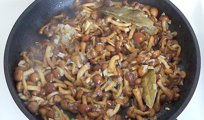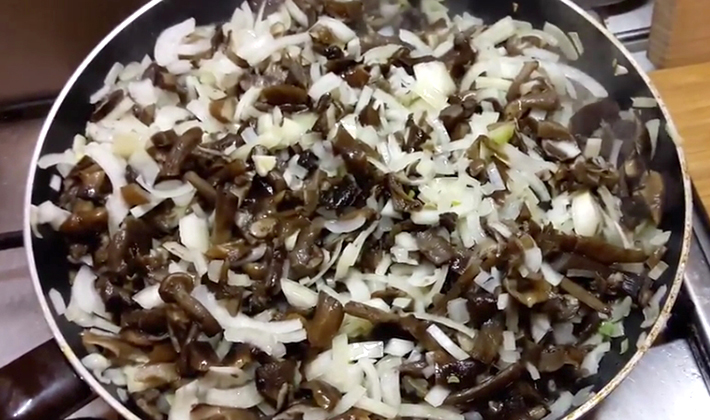 - Faire frire les champignons jusqu'à tendreté dans l'huile végétale, ajouter l'oignon haché en cubes et faire frire 10 minutes.