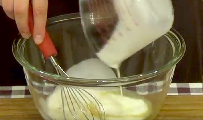 - Verser du lait tiède ou de l'eau, mélanger jusqu'à obtenir une masse homogène.