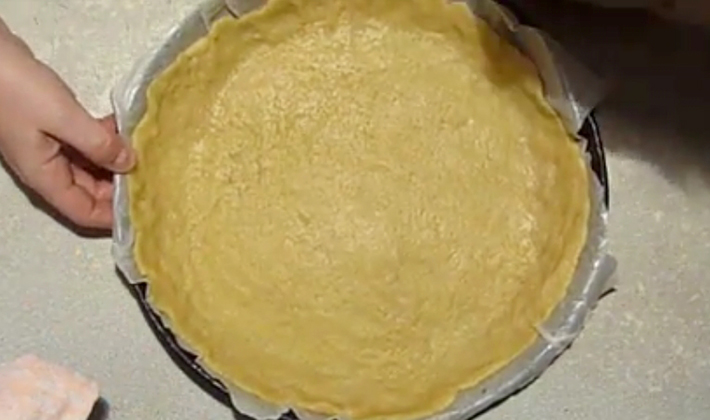 - Divisez la pâte en deux, étalez la première couche et mettez une plaque à pâtisserie graissée.