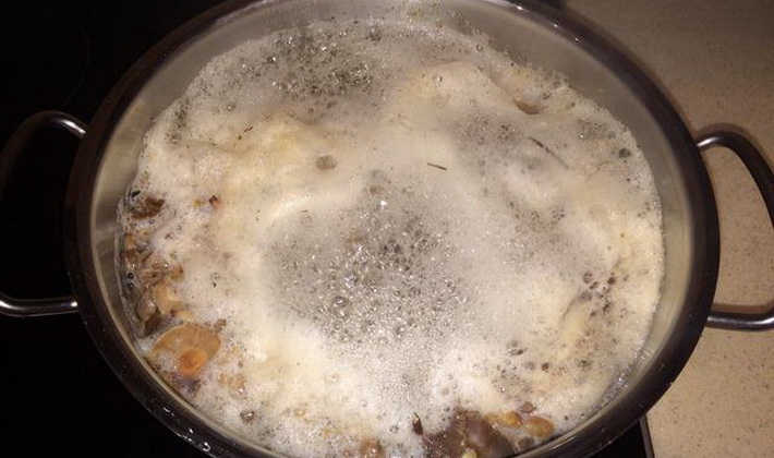 Faire bouillir les champignons dans de l'eau salée pendant 20 minutes, les rincer sous le robinet et les laisser tomber dans une passoire.