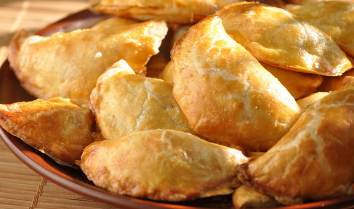 Étaler une fine couche de pâte, couper en carrés, déposer la garniture au milieu et relier les deux coins en écrasant les bords.