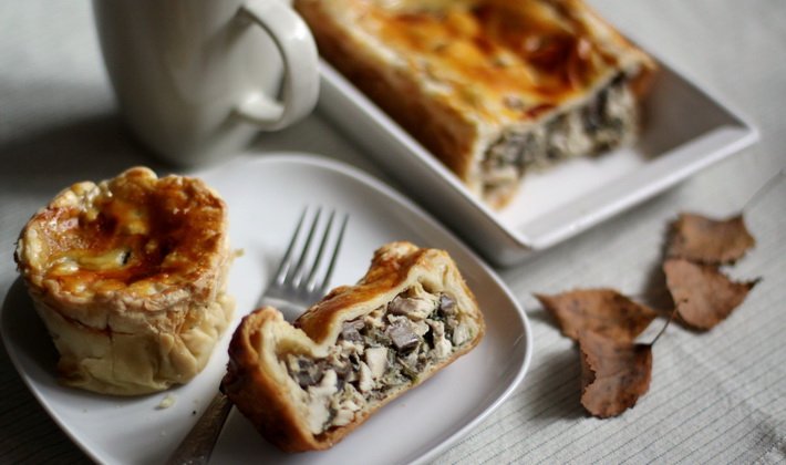 - Pâtes feuilletées au miel, aux champignons et au poulet
