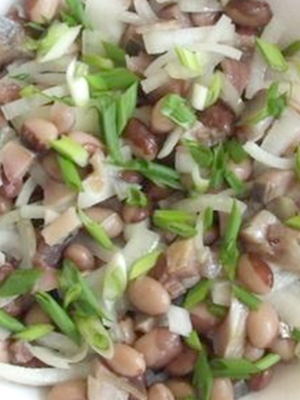 - Bouillie à l'avance d'haricots asperges mélangés avec des champignons et des oignons refroidis.