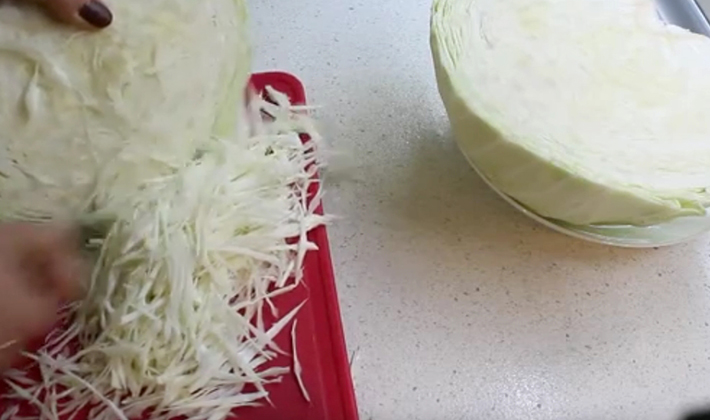 Hacher finement le chou, couper l'oignon en demi-rondelles, couper les champignons en cubes, les tomates en tranches, les carottes en lanières.
