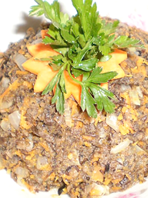 - Tous les ingrédients sont mélangés jusqu'à consistance lisse et disposés dans un saladier profond.