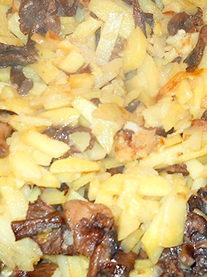 - Les champignons sont également broyés, mélangés à des pommes de terre, tout est salé et poivré au goût.