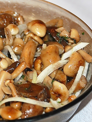 - Les champignons marinés sont lavés à l'eau froide, mélangés avec des rondelles d'oignon et de l'aneth haché.