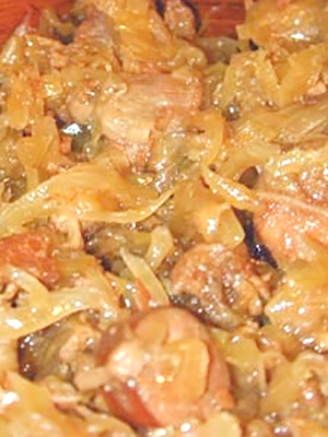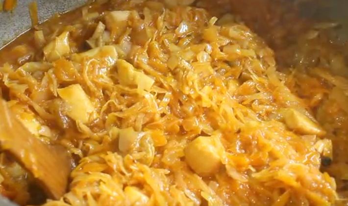 - Ajouter les oignons pelés et coupés en dés et ajouter la crème sure diluée avec de l’eau.