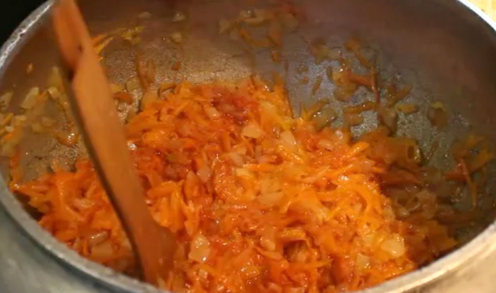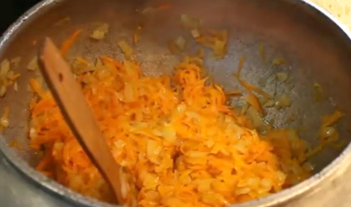 - Les oignons en dés sont introduits et rôtis avec de la viande pendant 7 minutes supplémentaires.