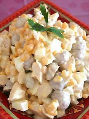 Salade avec poitrine de poulet, champignons sautés, maïs et légumes est un merveilleux plat froid qui peut être servi à l'arrivée des invités sans être perdu.
